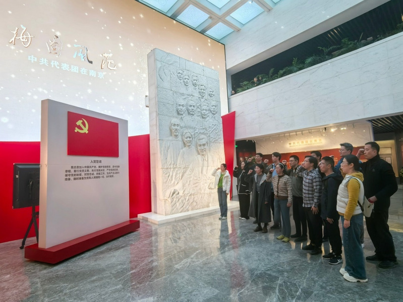 随后,老师们转至梅园新村纪念馆。作为中国共产党早期革命活动的重要阵地,梅园新村承载着深厚的红色记忆。在纪念馆展厅,党员们认真参观了中共代表团办事处旧址、国共南京谈判史料陈列馆等,回顾了周恩来为首的中共代表团在南京与国民党政府进行国共和平谈判的革命历史,感受到了老一辈革命家的坚定信念和高尚情操。参观结束后,全体党员面对鲜红党旗,举起右拳庄严宣誓,重温入党誓词。铿锵的誓言响彻展厅,彰显了传承革命精神、永葆政治本色的坚定信念。